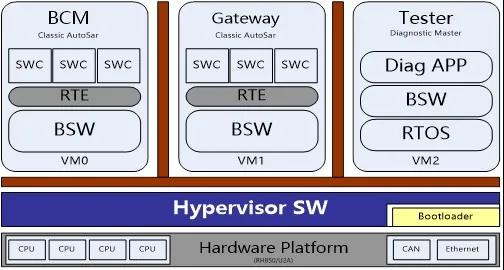 没有一颗好大脑,再健壮的四肢也只能是摆设。为此,球友会采用了一颗高性能、大算力、多核的MCU大脑,并在底层软件搭建Hypervisor(即虚拟机监视器),可允许多个VM虚拟机系统共享硬件,能让集成系统“一心三用”,同时运行车身控制功能的 AutoSar系统、Gateway的AutoSar系统和运行诊断的RTOS系统三个独立的VM虚拟机子系统,充分发挥各大硬件性能,高效智能掌控车身全域。